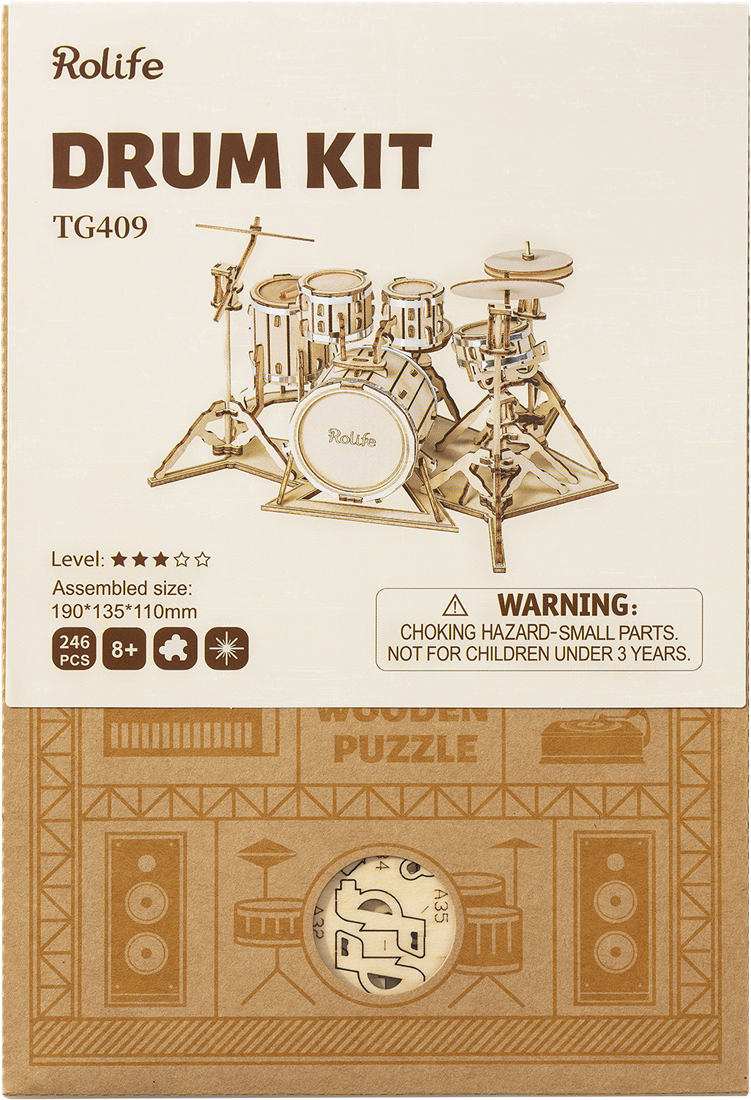 De TG409 Robotime Drum Kit is een cool houten bouwpakket van Rolife, ideaal voor volwassenen en kinderen vanaf 8 jaar.