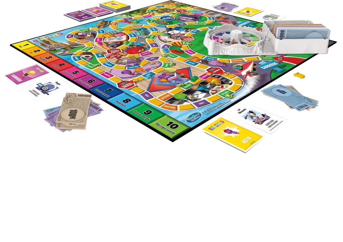 Plaats kleurrijke staafjes in de auto en draai aan het rad om je over het speelbord te verplaatsen langs je levensweg van de start tot aan je pensioen. Elk Stop!-vakje vertegenwoordigt een belangrijke mijlpaal in het leven. Hier moeten spelers draaien aan het rad om hun lot te kennen of zelf hun weg kiezen. Beslis of je al dan niet gaat trouwen, een gezin sticht of vroeg met pensioen gaat. Actiekaarten bieden spelers opties over de afloop van hun avonturen!